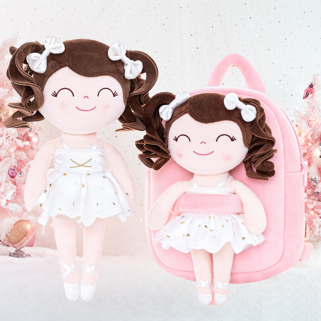 Cada muñeca, con su vestido iridiscente y su lindo cabello rizado, encarna a la perfección los sueños y aspiraciones de una joven bailarina. La mochila a juego no solo es práctica para llevar elementos esenciales como pequeños libros ilustrados, sino que también agrega un elemento de magia y asombro, lo que la convierte en el accesorio perfecto para la escuela o para jugar.
